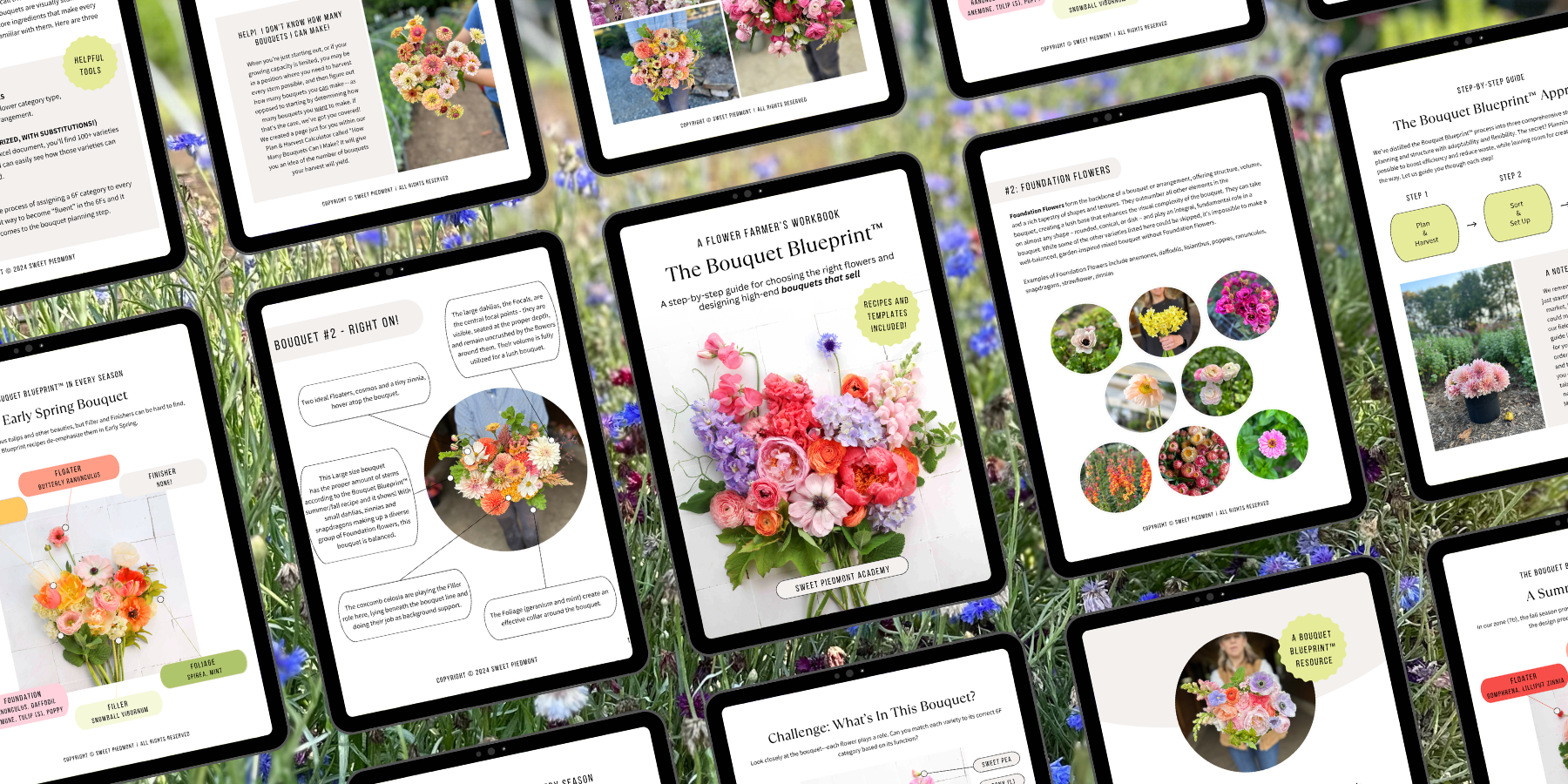 Designing without the Bouquet Blueprint was confusing to plan for, chaotic to execute, and resulted in bouquets that frankly didn’t look to great and didn’t sell too well. Now that we use the Bouquet Blueprint at Sweet Piedmont, we harvest according to recipes, design with efficiency, and sell out our subscriptions, farmers markets, and more.